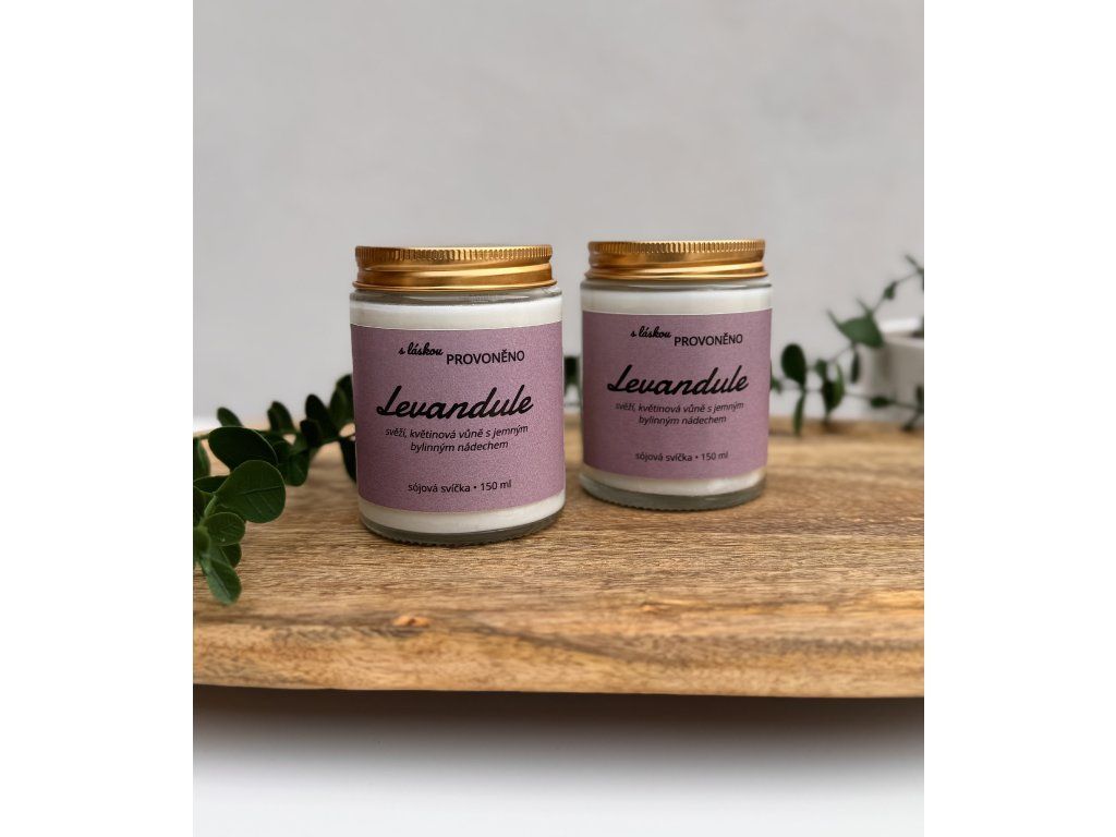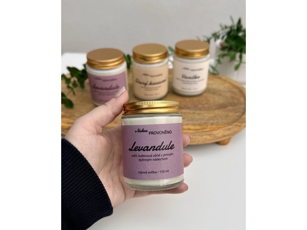 Ručně vyráběná sójová svíčka s jemnou vůní levandule ve skleněné nádobě se zlatým víčkem.