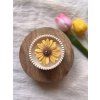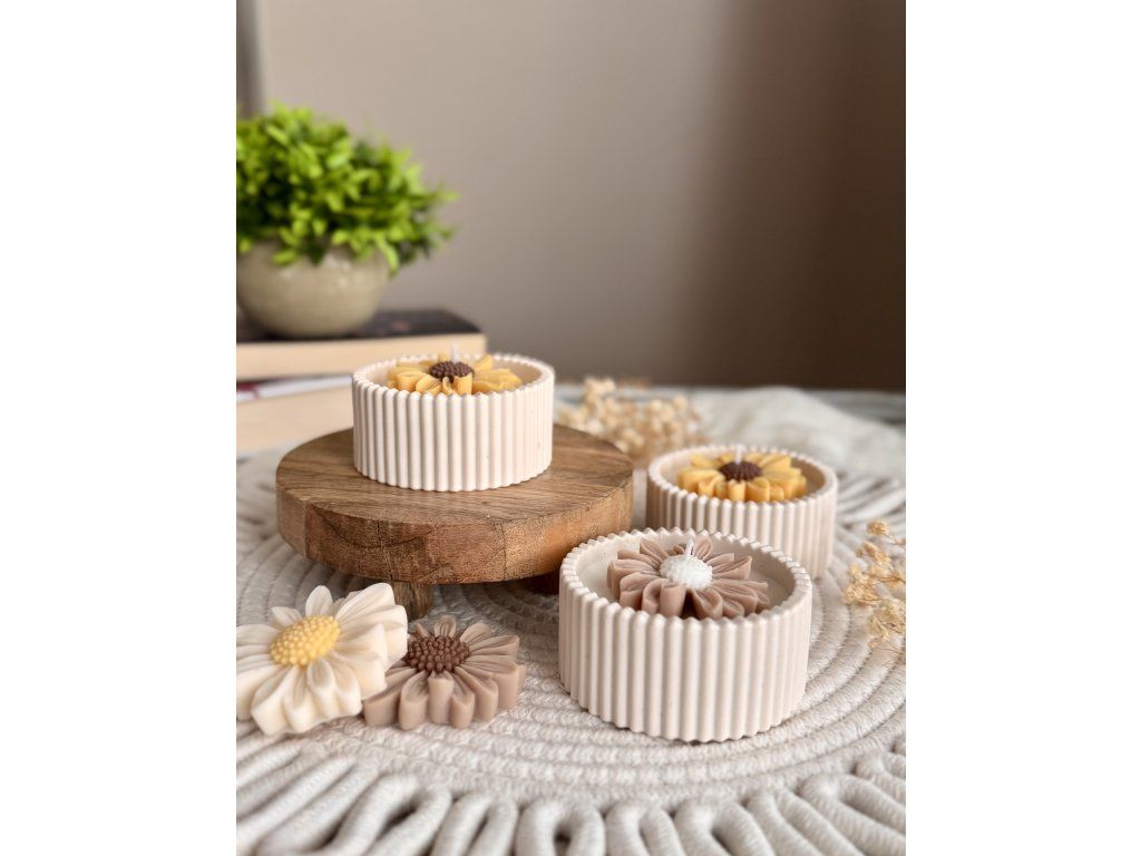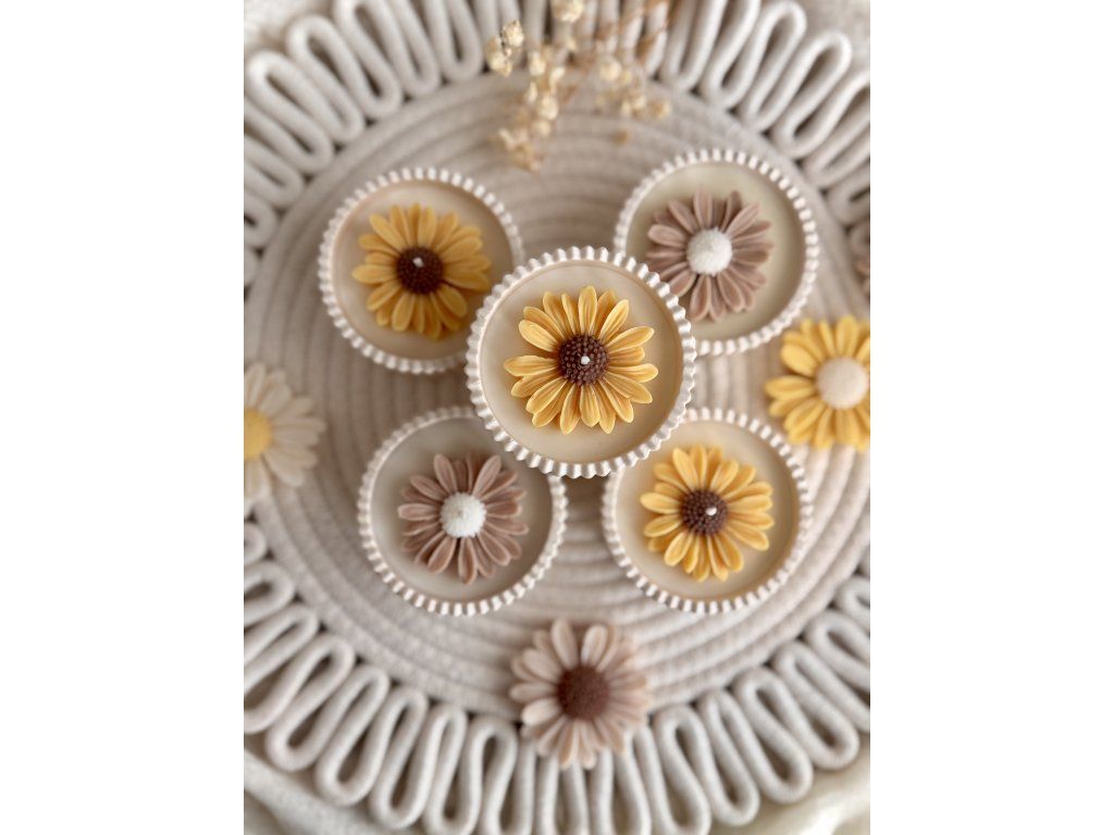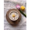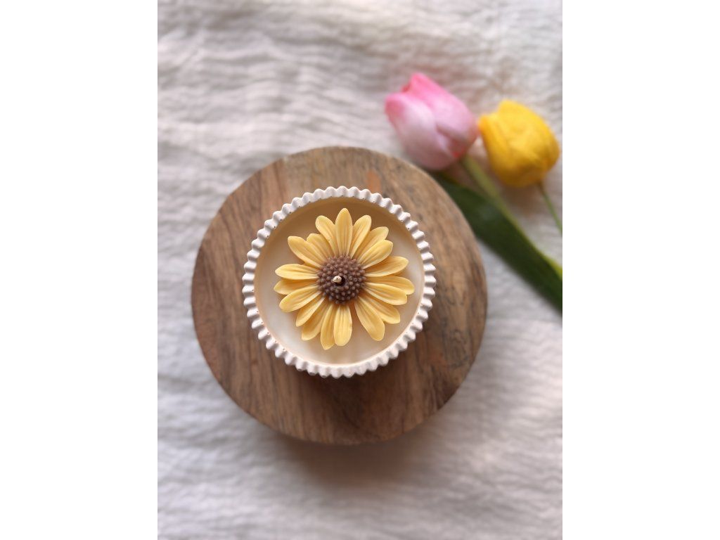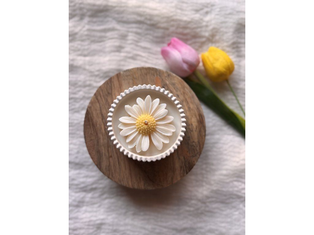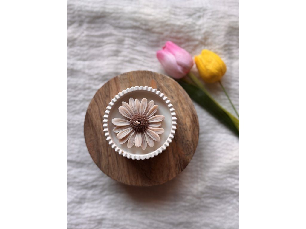 Ručně vyráběná sójová svíčka s květem sedmikrásky s jemnou vůní francouzského šeříku v Jesmonite misce.